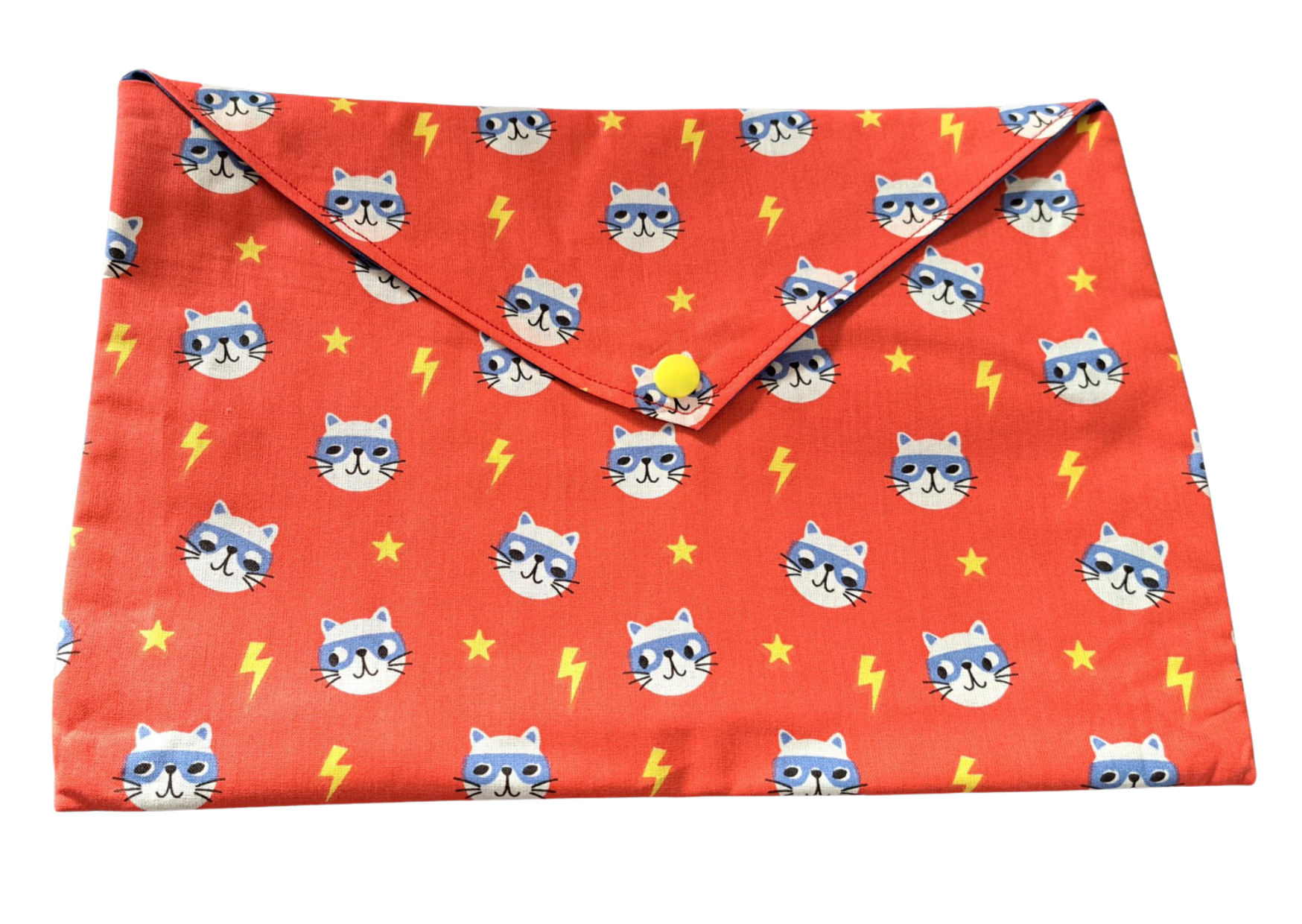 Magnifique pochette en tissu cousue main (motif chat), idéale pour ranger carnet de santé et papiers importants. (pochette rouge avec tête de chat)