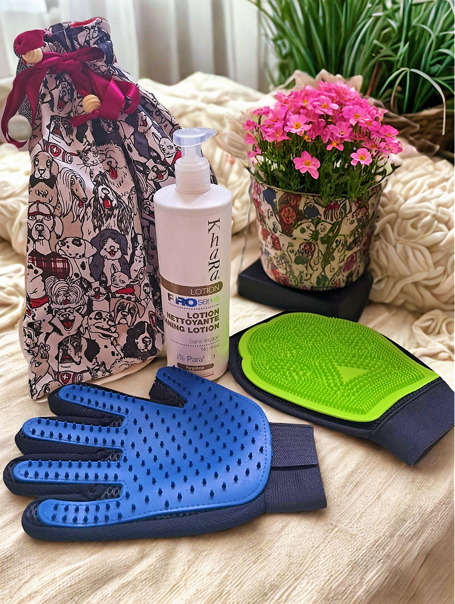 Pochon de toilettage cousu main avec 2 gants et une lotion nettoyante.